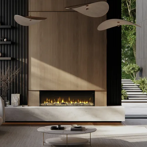 Permite a ligação de várias unidades para alcançar o comprimento desejado, proporcionando uma solução versátil e integrada. | Potente aquecedor com ventilação forçada, que oferece aquecimento adicional sempre que necessário. | Inclui um elegante conjunto de toros e vidro fosco. Em alternativa, está disponível um conjunto opcional de toros em carvalho. |