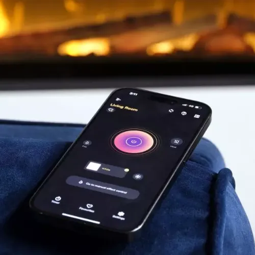 Todas as funções da lareira Ignite Evolve podem ser controladas através do seu smartphone, utilizando a aplicação Dimplex Flame Connect. Desde a saída de calor às cores da chama e do leito de combustível, passando pelo brilho e pela velocidade da chama – tudo pode ser ajustado com um simples toque. O controlo remoto Bluetooth da lareira também permite gerir todas as funcionalidades, oferecendo uma experiência de chama personalizada e encantadora.