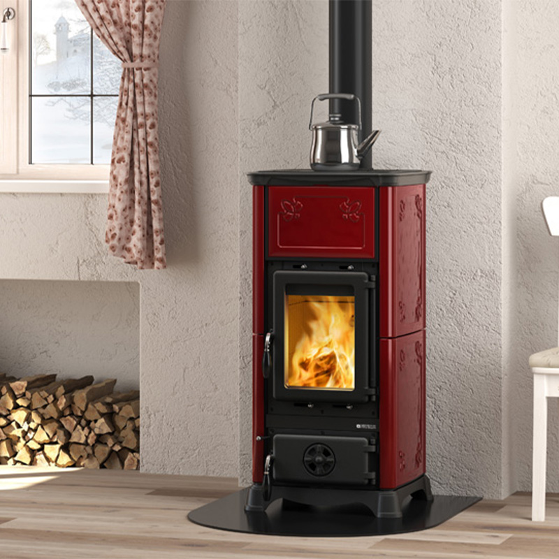 - Salamandra a lenha Emiliana com ar primário e secundário ajustável, ar terciário com sistema de pós-combustão pré-calibrado, da Nórdica & Extraflame.